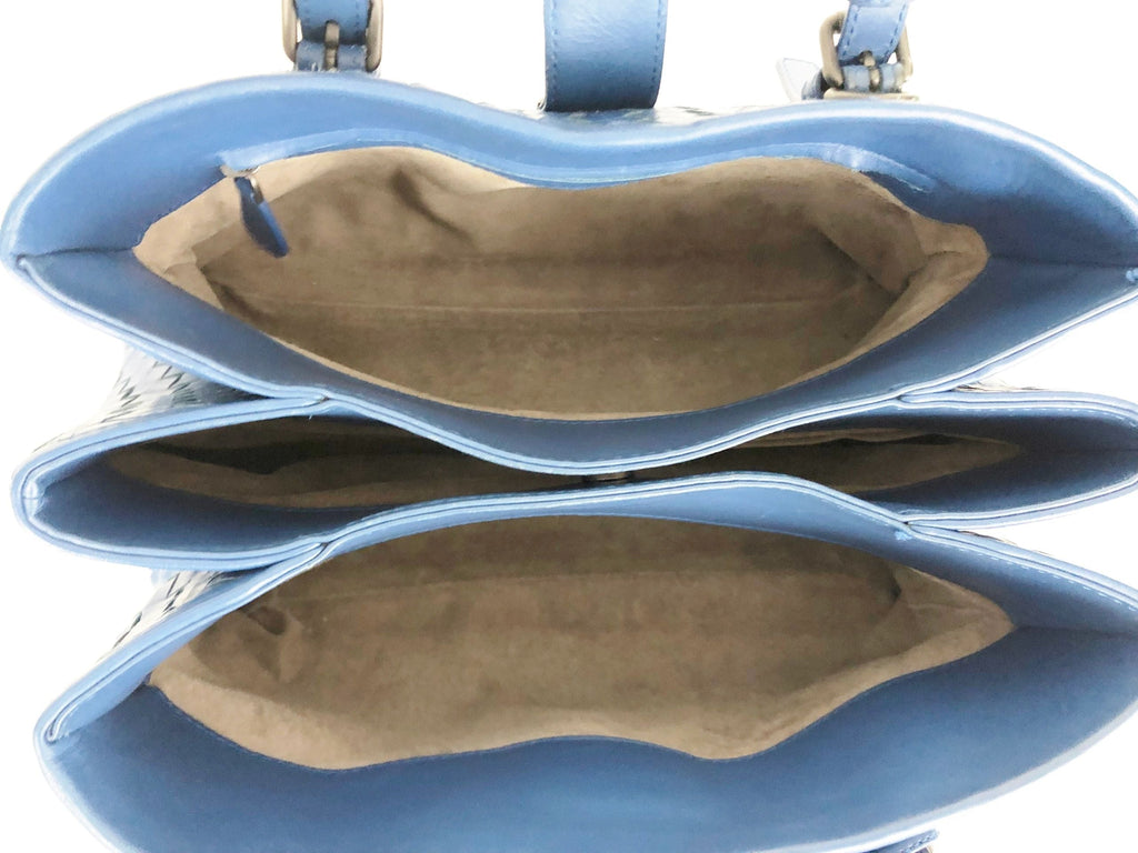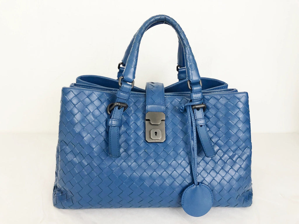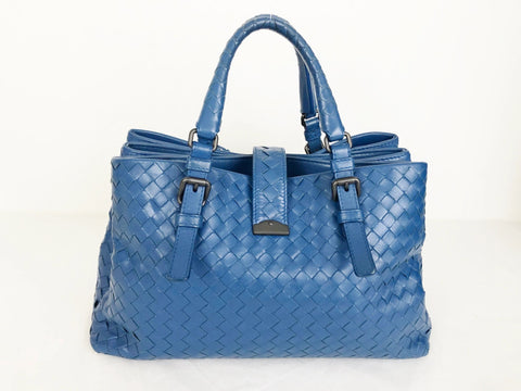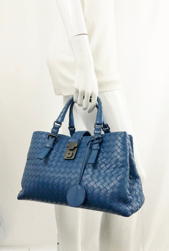 Description: Blue Intrecciato Leather Weave Roma Bag With Duel Rolled Handles, Push Latch Strap Closure With Gunmetal Hardware, Detachable Strap, Three Compartments, Single Flat Strap, Top Zipper Closure, One Interior Zipped And One Slip Pocket, And Beige Suede Lined. Includes Dust Bag. All Kmk Luxury Consignment Merchandise Is 100% Guaranteed Authentic. Color: Blue. Measurements: Width: 12 In. Height: 7 In. Depth: 6 In. Handle Drop: 5 In. Strap Drop: 22 In. Fabrication: Leather. Suede Lined. Condition: Pre-Owned In Very Good Condition.