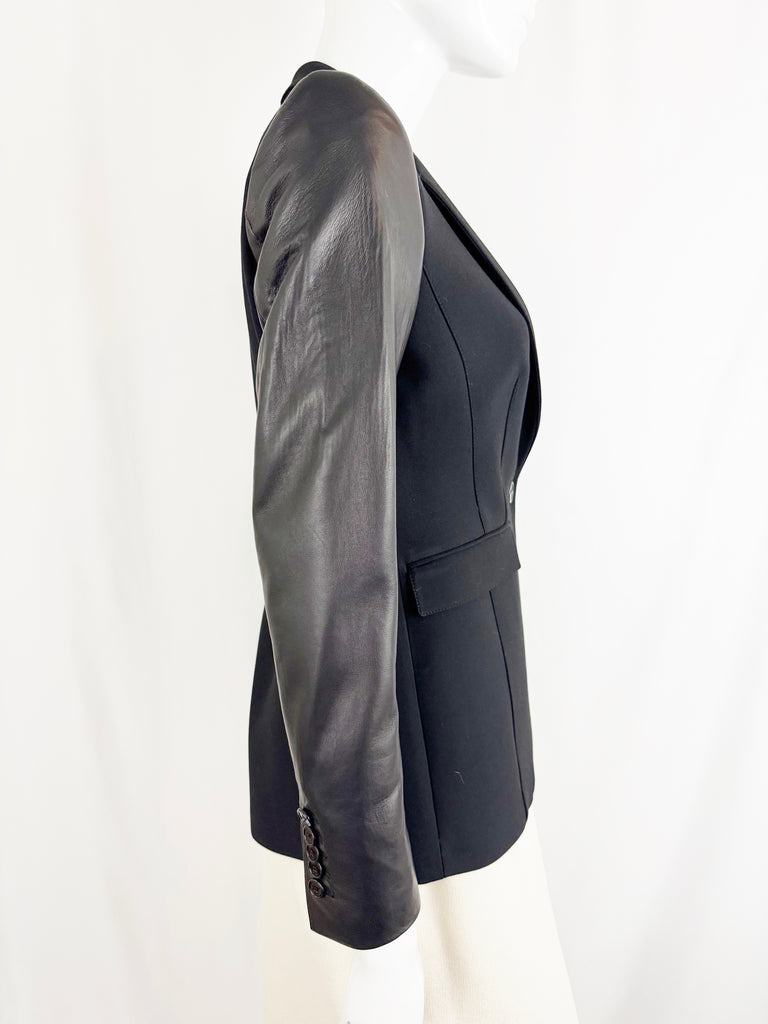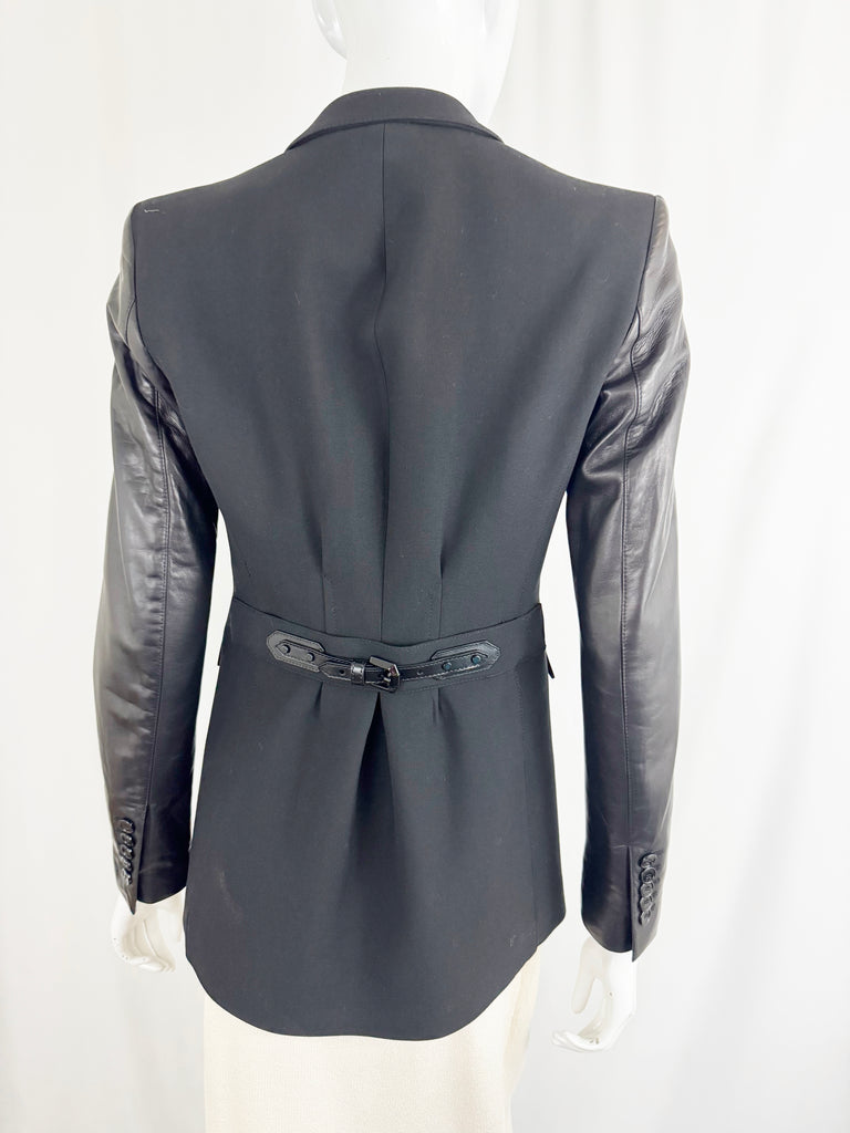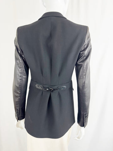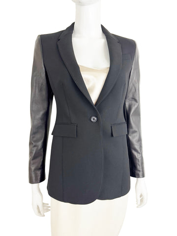 Description: Gorgeous black single button jacket with leather sleeves, duel front and lapel pocket (which haven't been opened), back leather adjustable tab, button cuffs and fully lined.