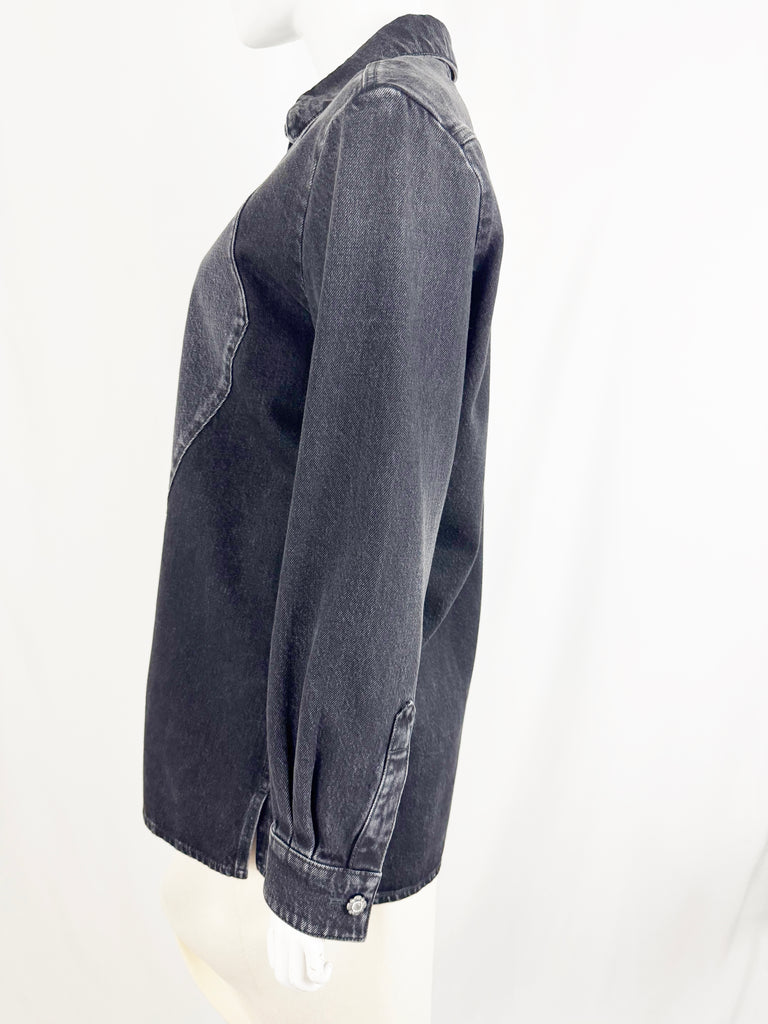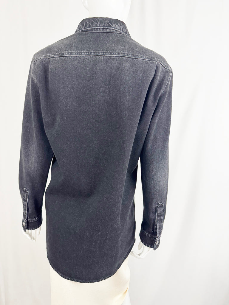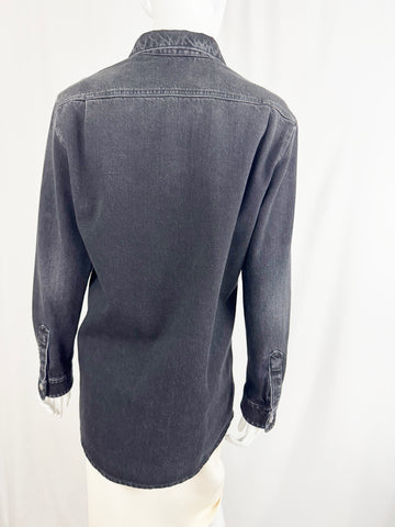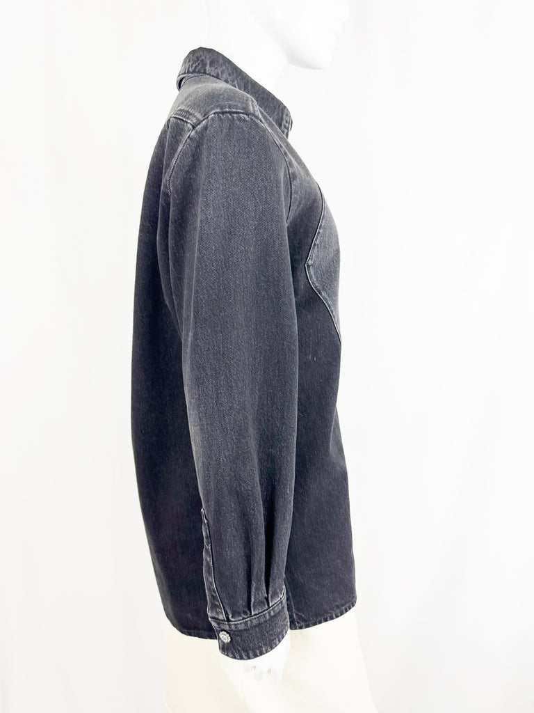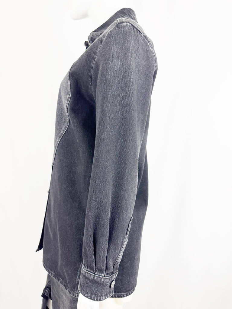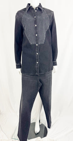 Description: 2024 black denim shacket featuring tuxedo like front, 8 ornate button closure, single button cuff, and unlined. Pair this with the jeans being sold separately.