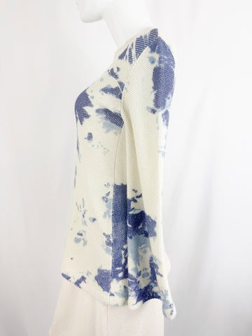 Description: Longer nubby ivory and blue cashmere sweater with crew-neck and faint bell sleeves.