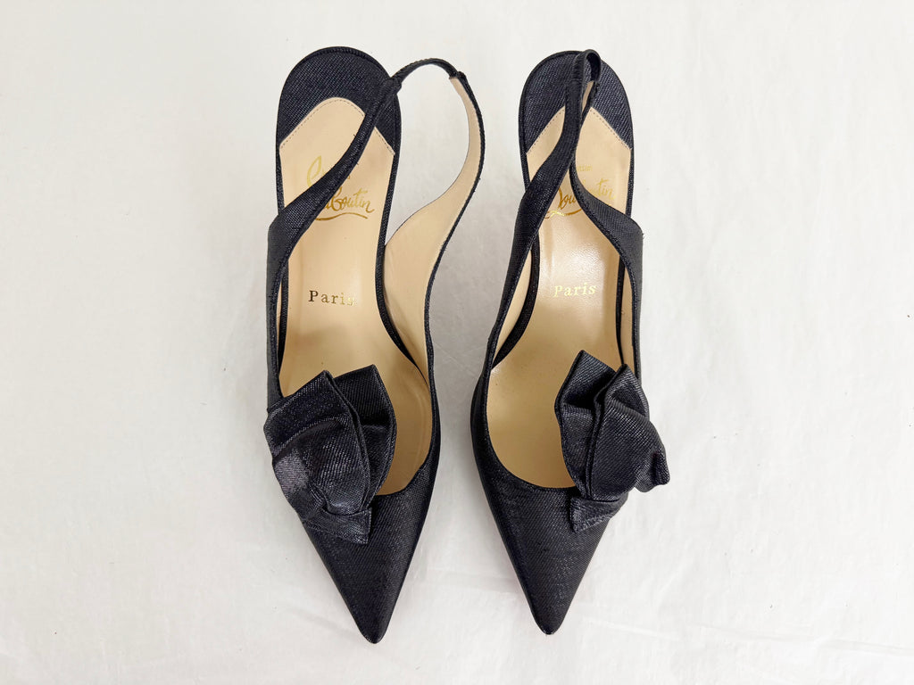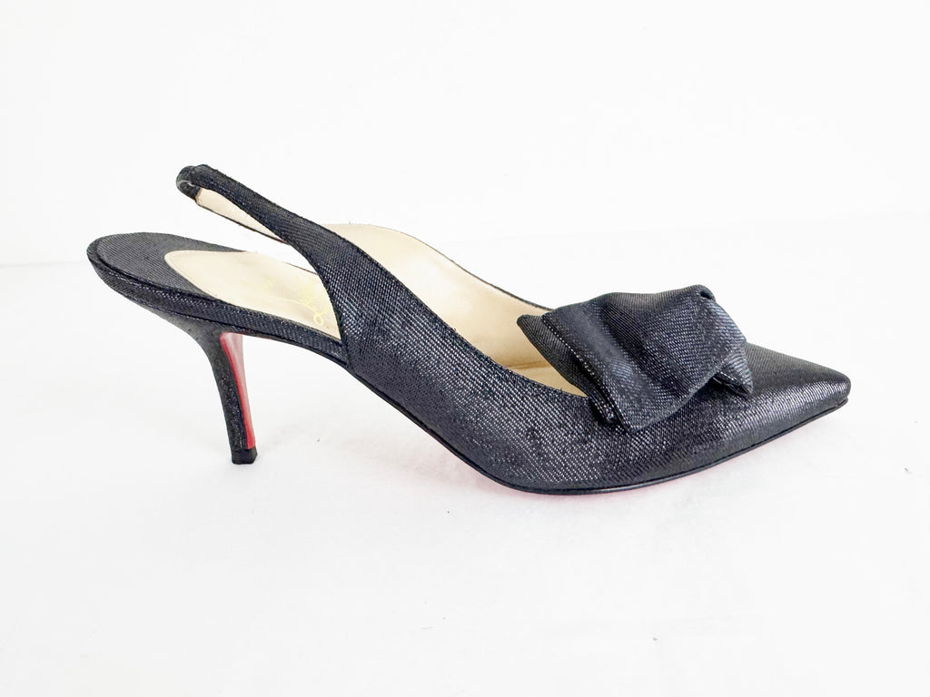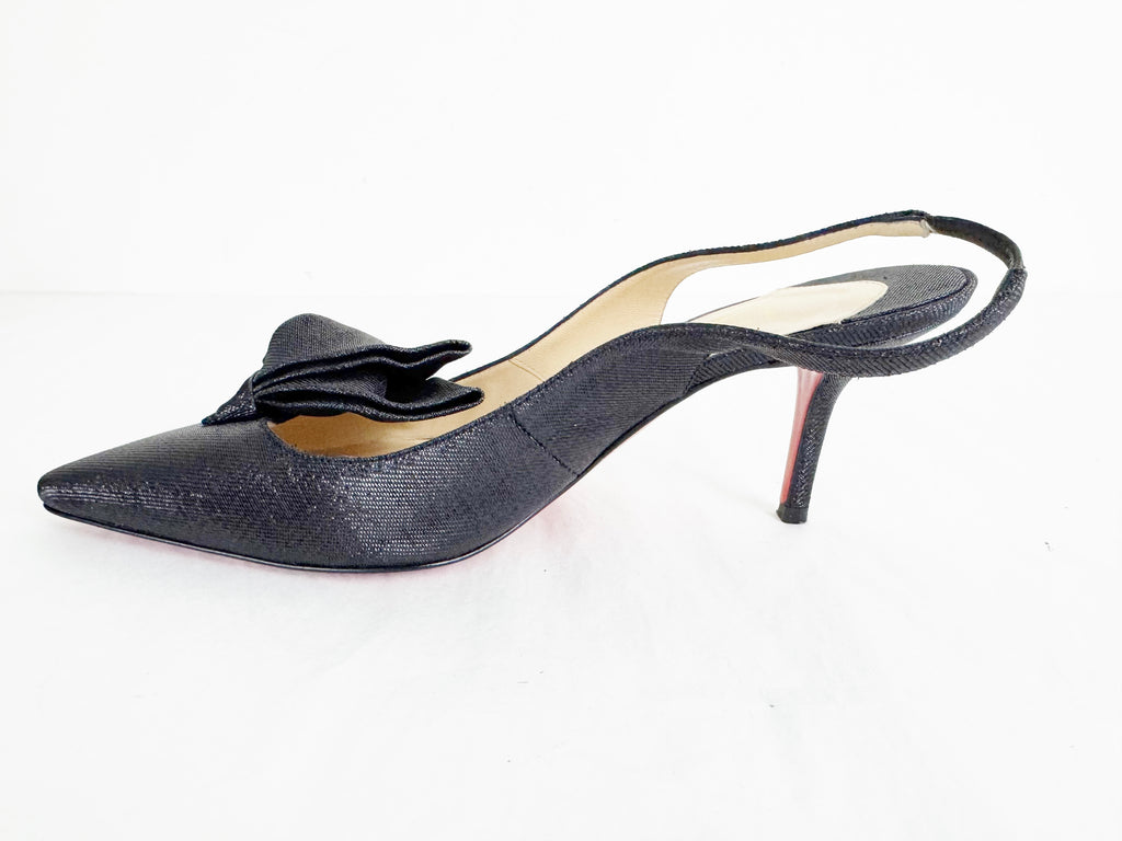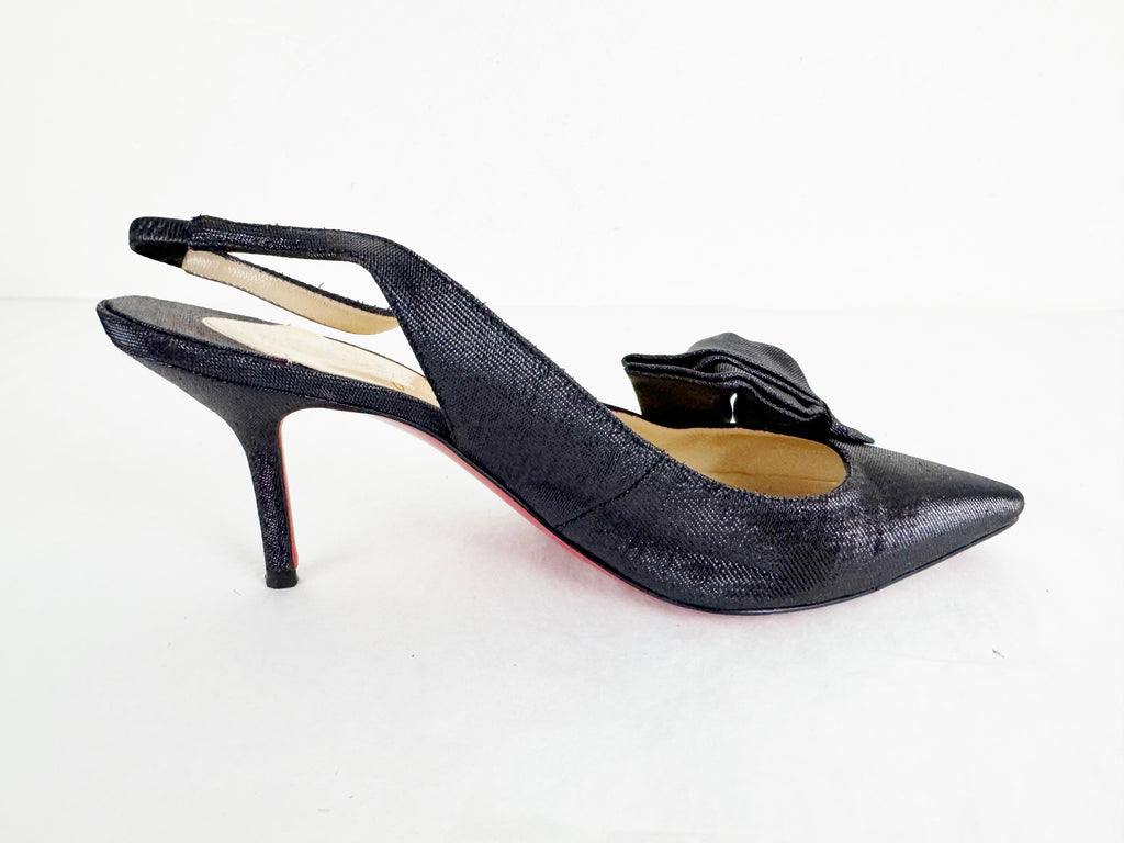 Description: Navy metallic canvas slingback featuring bow accent on the vamp, covered heel with elastic strap, leather lined and soled.
