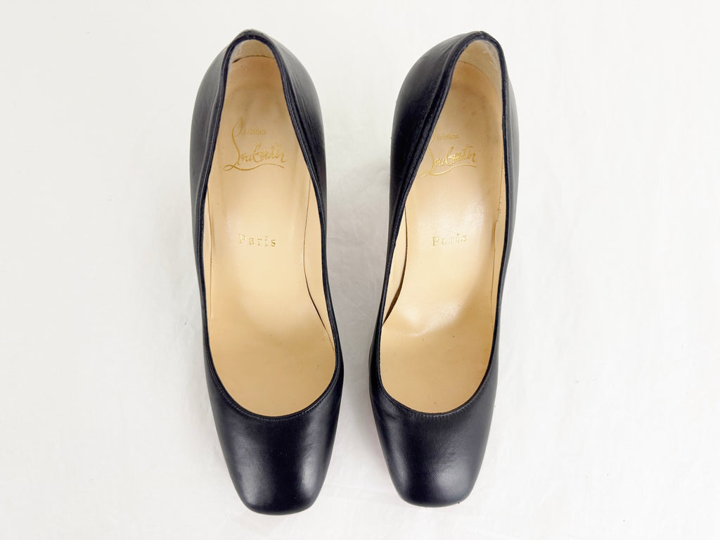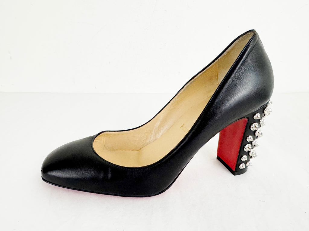 Description: Black leather pumps featuring slight square toe, silver toned stud accent on block heels, leather lined and signature red leather lacquer sole.