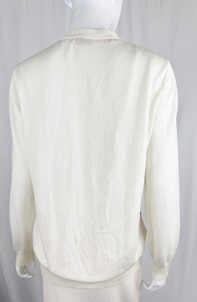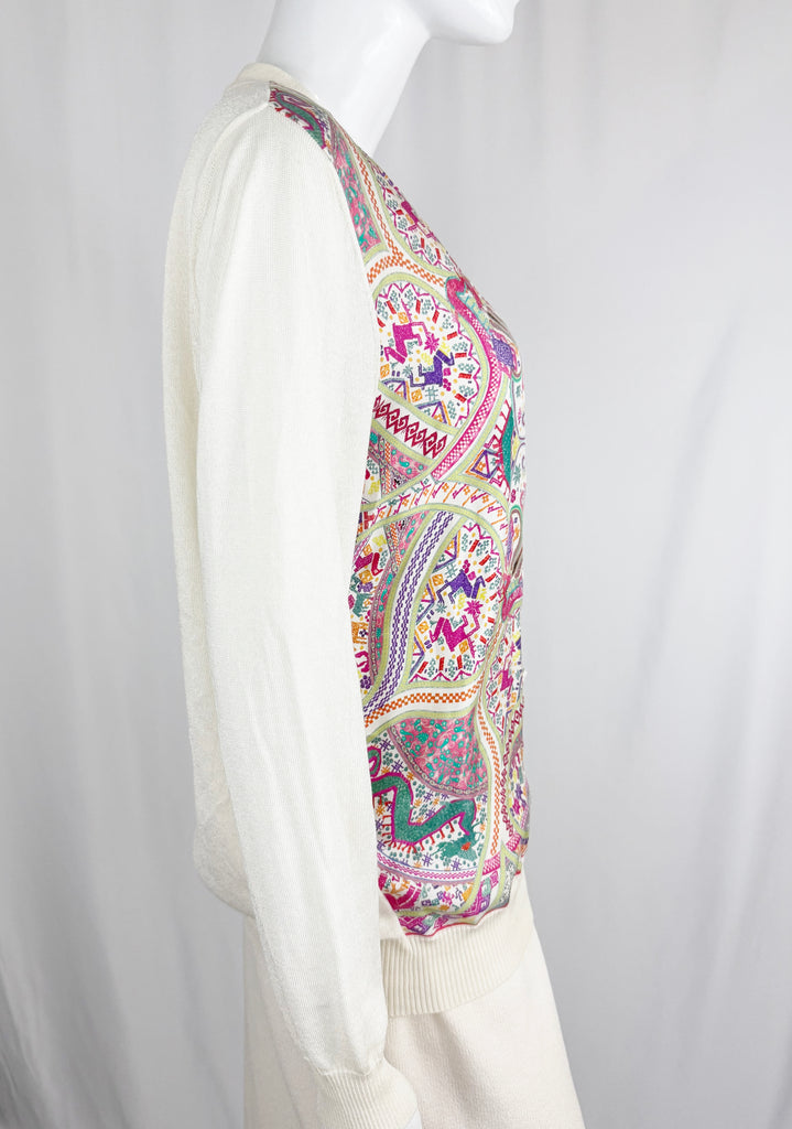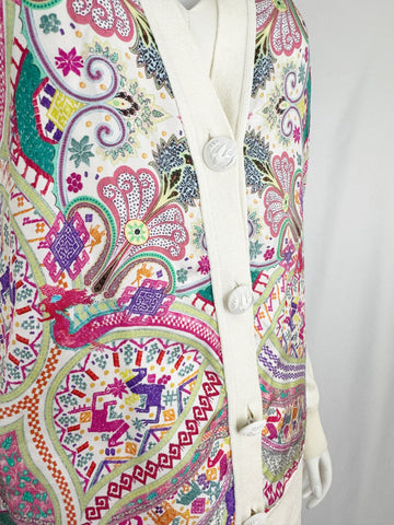 Description: Ivory cardigan with silk patterned front and five button closure.