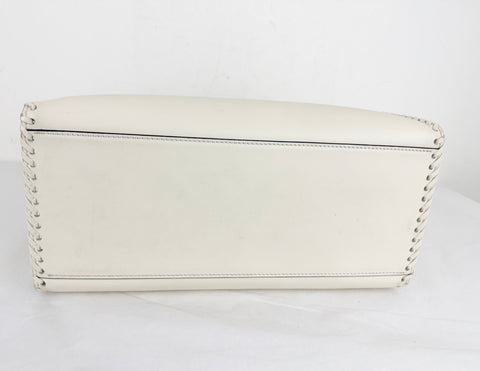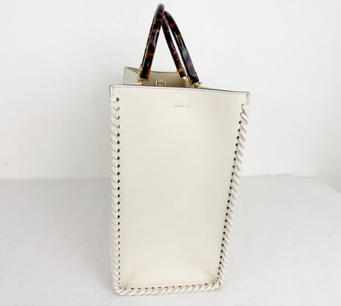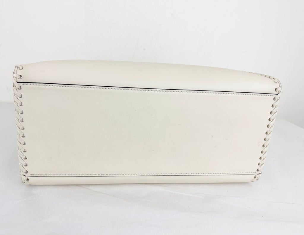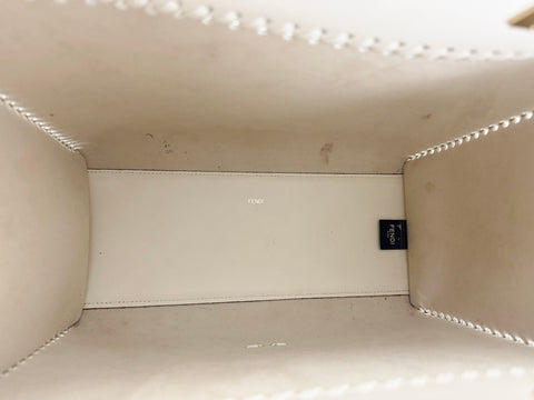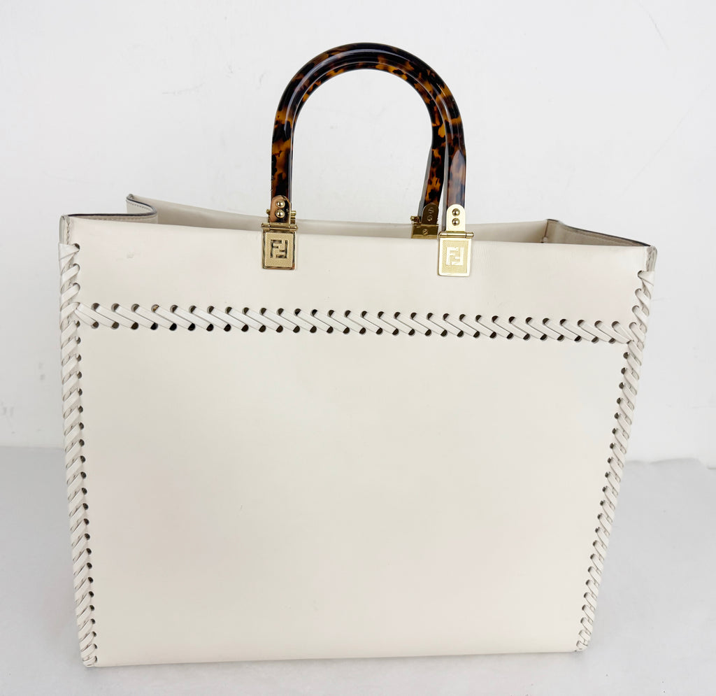 Description: Ivory medium tote featuring front FENDI logo, dual tortoise handles, whipstitch throughout, detachable shoulder strap, suede lined. Includes dustbag