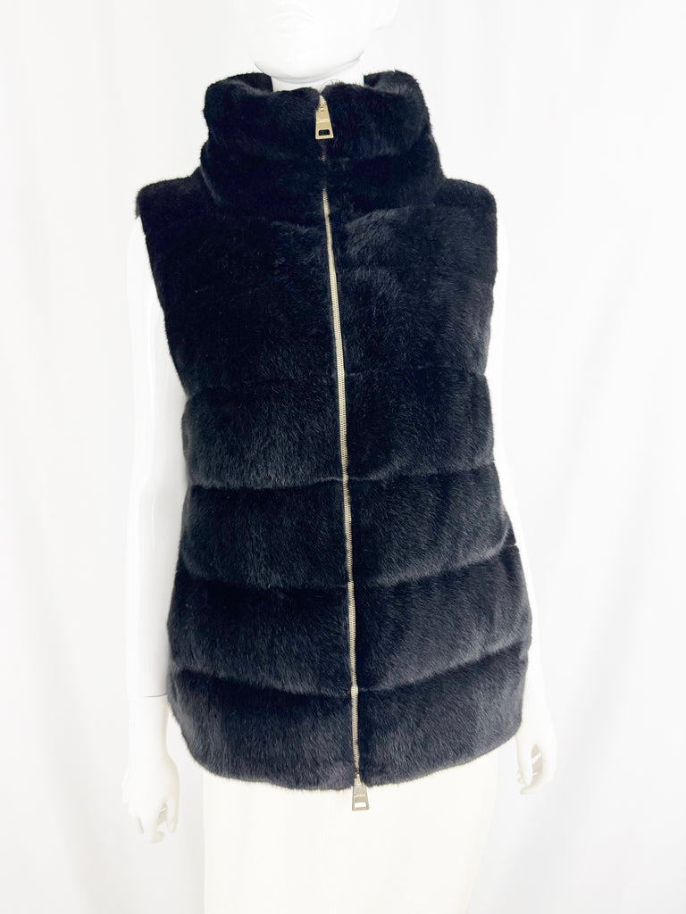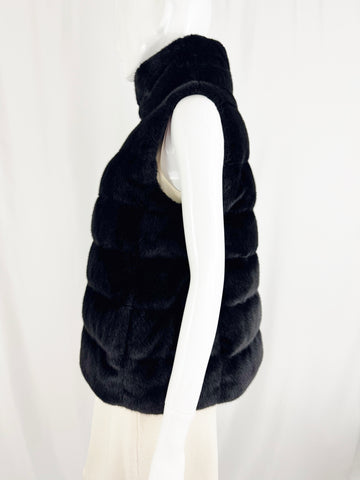 Description: Black faux fur down vest with two way gold-tone zipper, two side pockets and nylon lined.