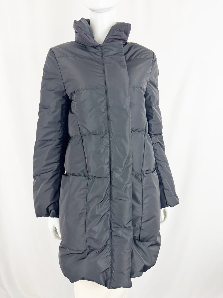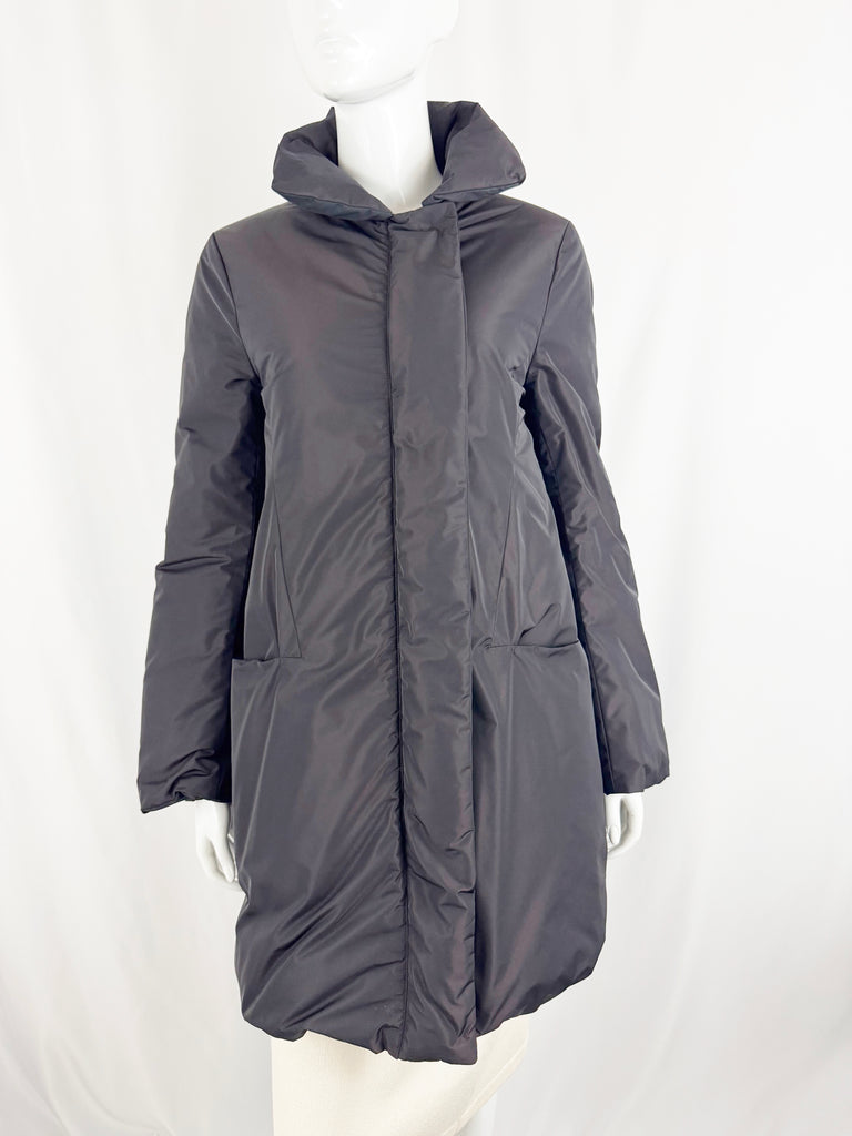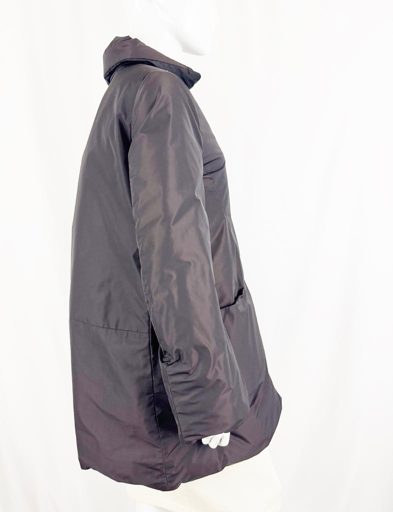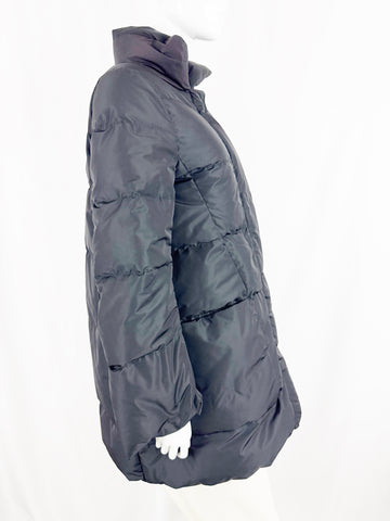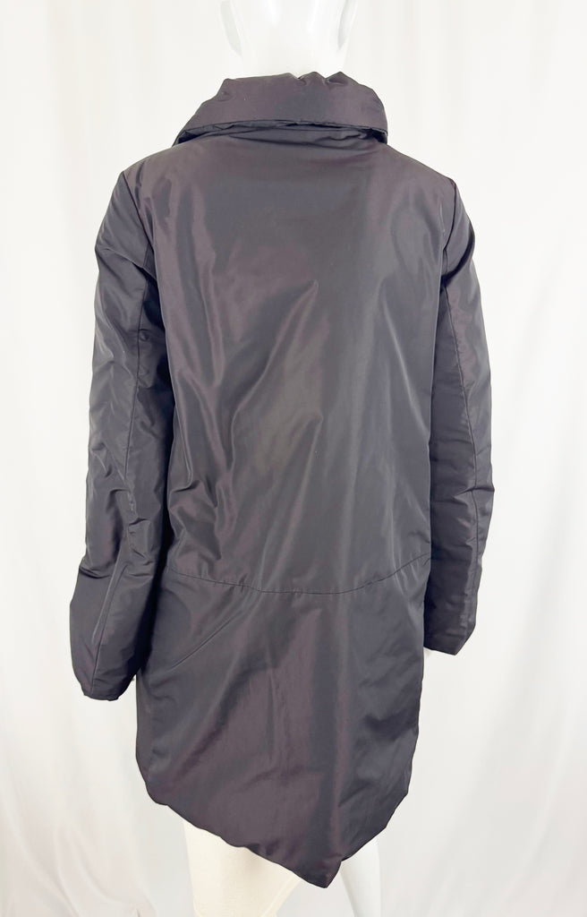 Description: Warm reversible puffer with eggplant colored smooth side with large front pockets, two way zipper and magnetic snaps. Reversible side is black quilted with large pockets as well
