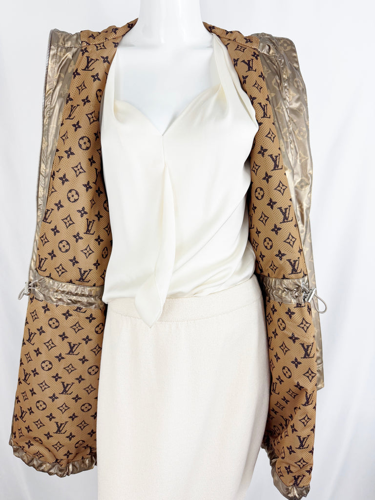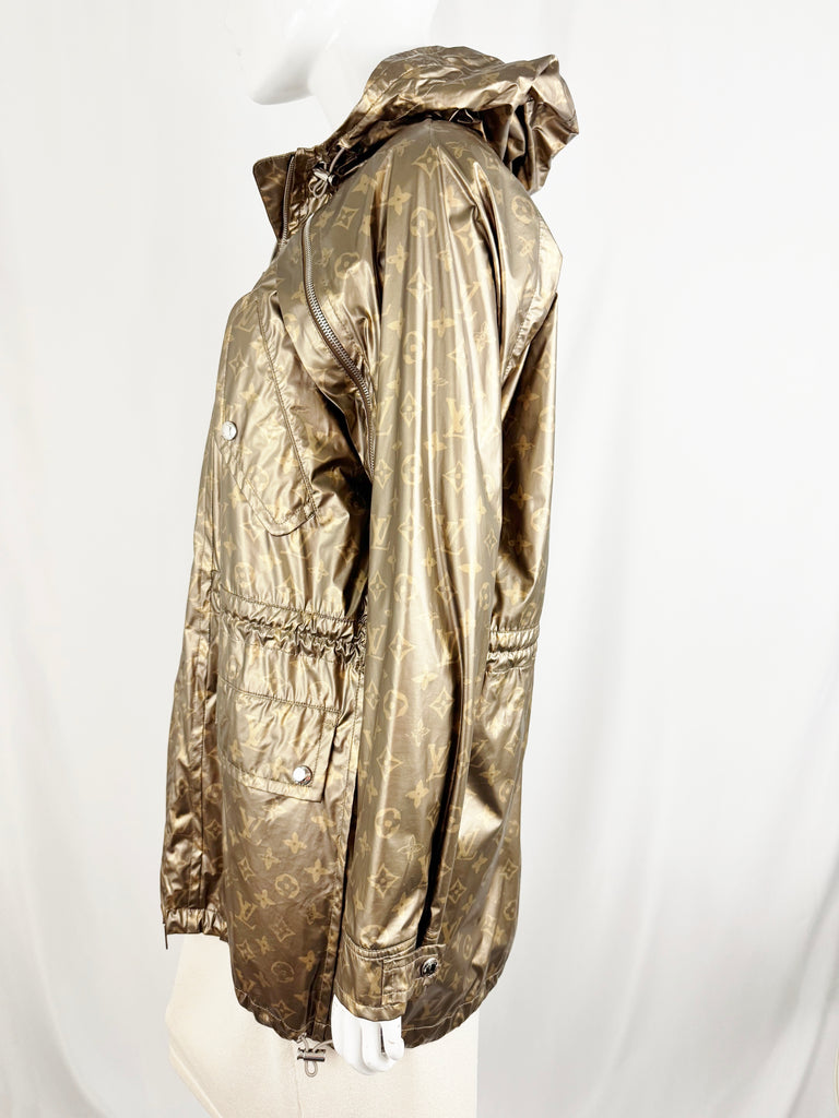 Description: Fabulous gold logo modal coat featuring attached hood, zipper on sleeve accent, four front pockets, two way zipper closure, waist, hem and hood cinch cord, and fully lined in logo mesh.