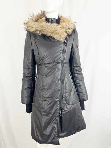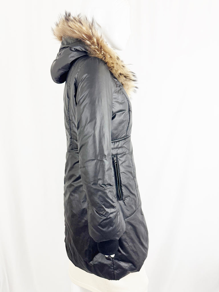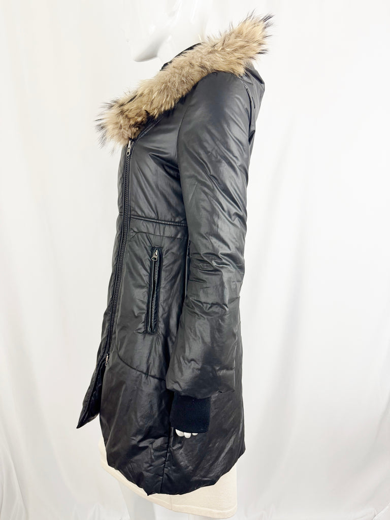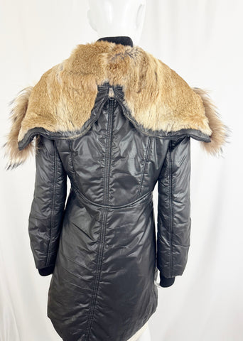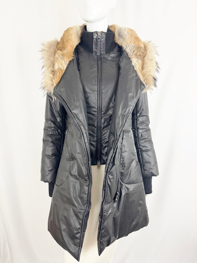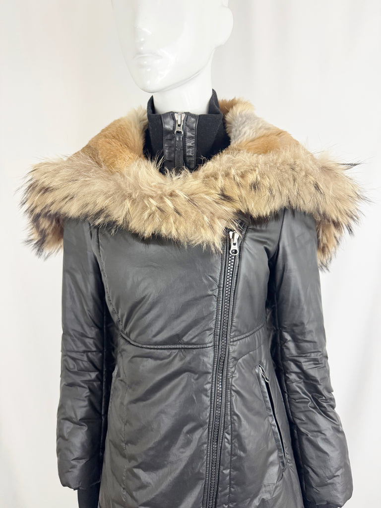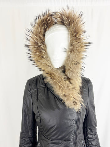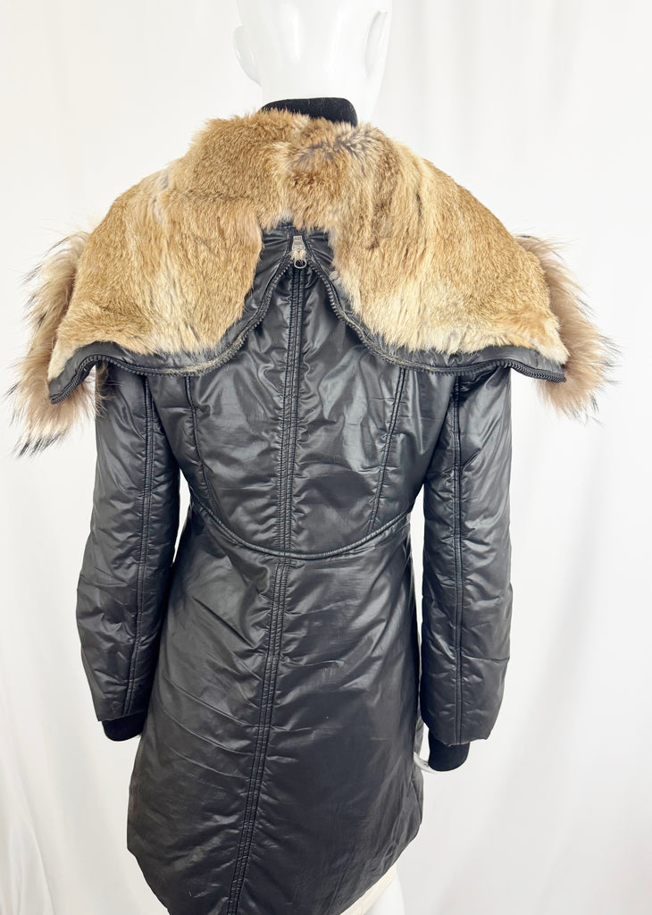 Material: Exterior, lining and filling: 100% polyester; Raccoon Trim and rabbit hood.