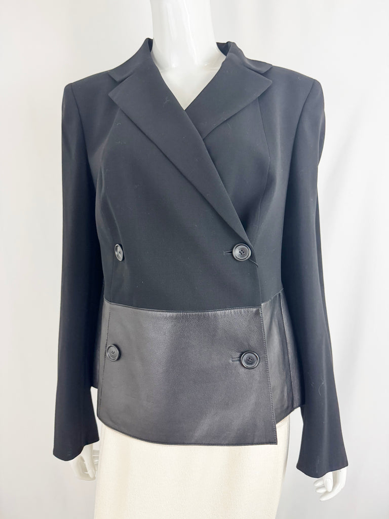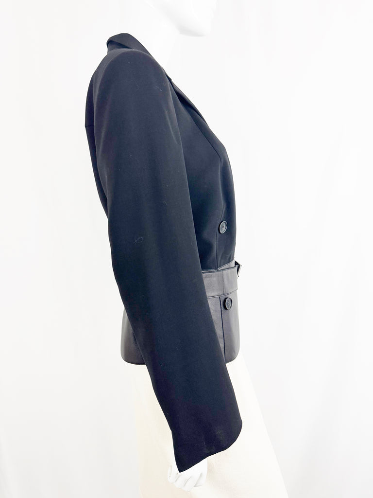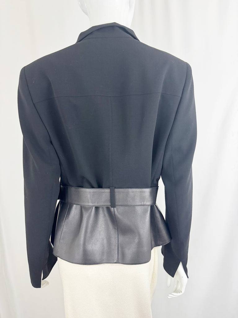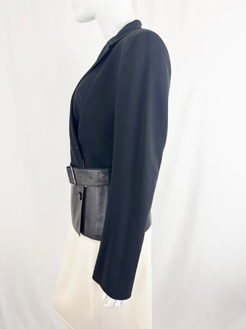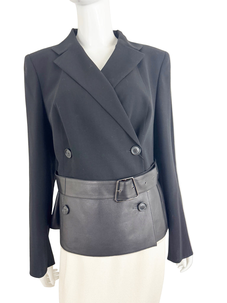 Description: New black wool jacket with leather bodice, leather and wool adjustable belt, double breasted with three button closure, hidden pockets, and fully lined. Retail: $3,990