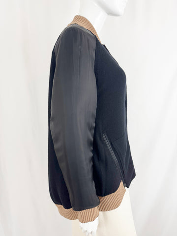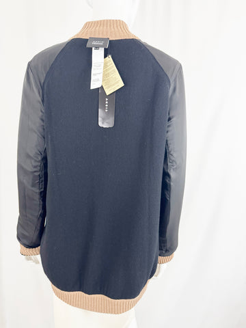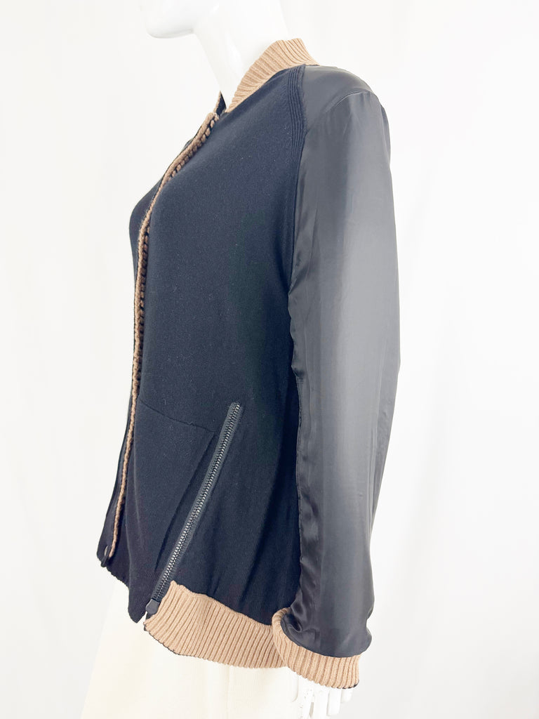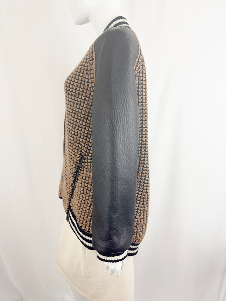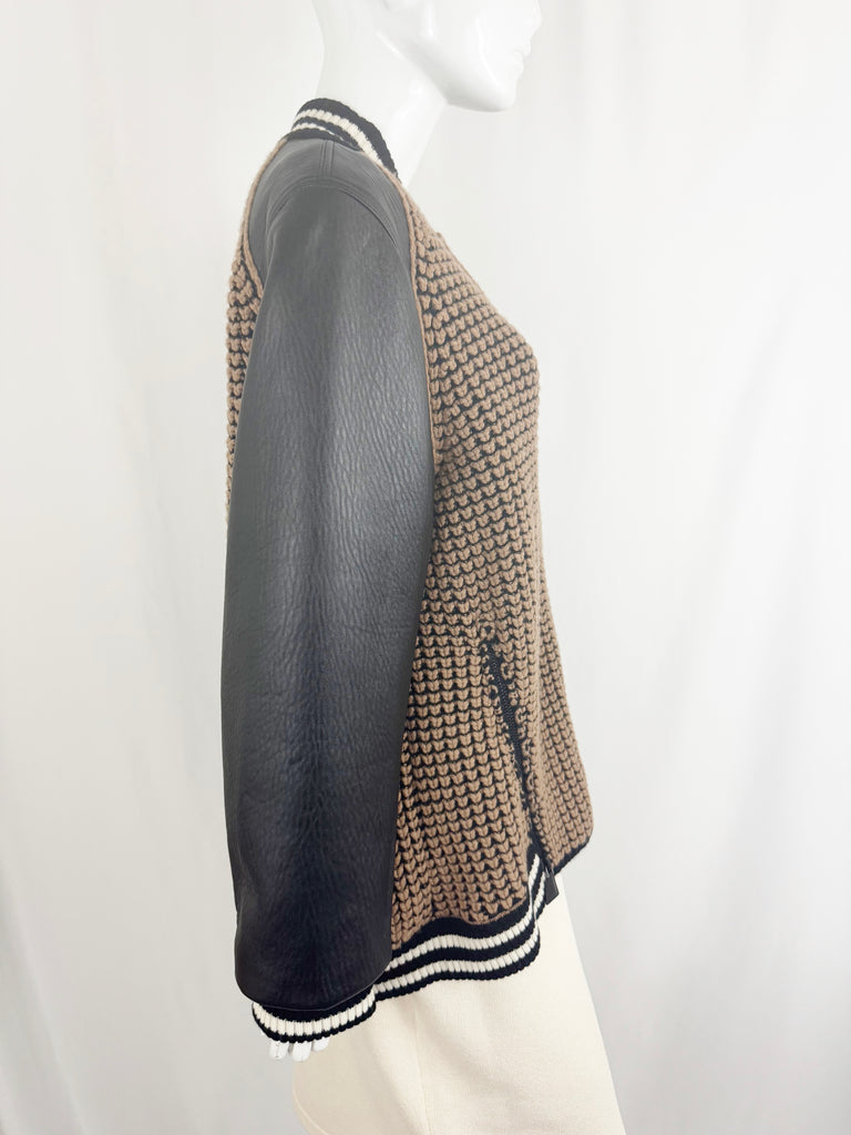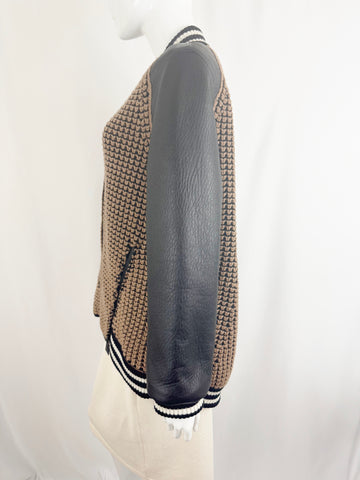 Description: Stunning reversible, 100% cashmere tan and black knit bomber featuring black leather sleeves, black and white knit trim and eight snap closure. Reverses to sold black cashmere. Retail: $4,990