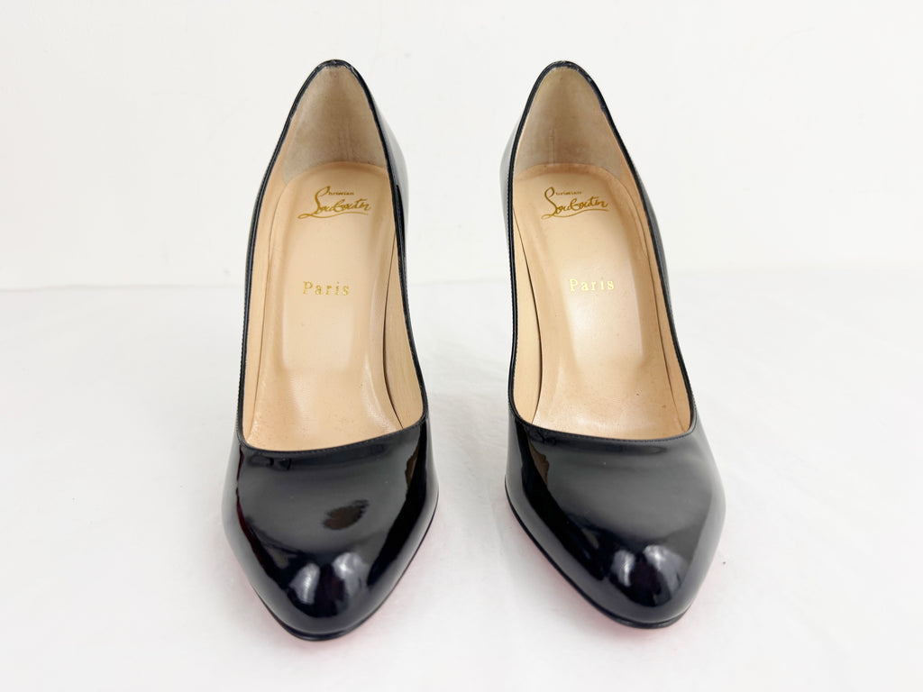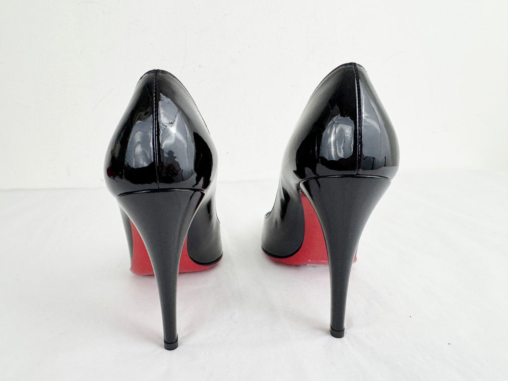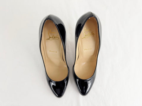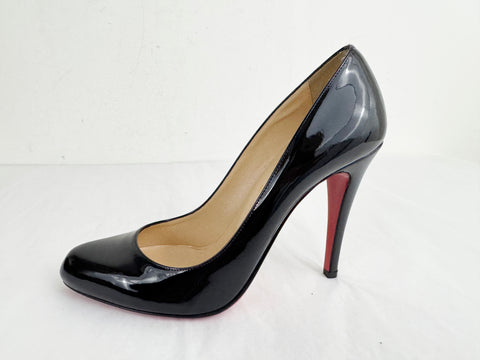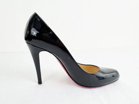 Description: Black patent pump with almond toe, 4.25 inch heel, leather lined and signature red lacquer sole. Includes dustbag.