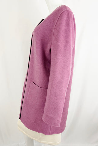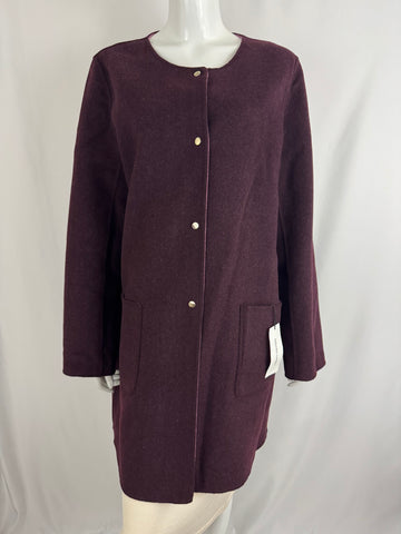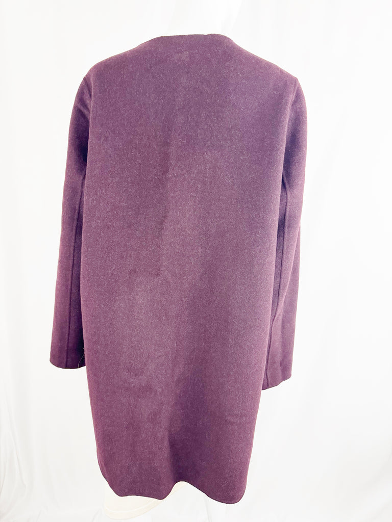 Description: 100% wool coat with bordeaux on one side, and magenta on the other, four snap closure, collarless and two patch packets on both sides. Retail: $945
