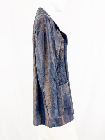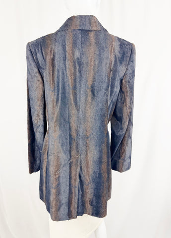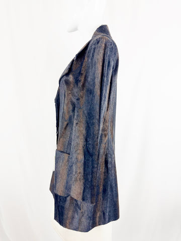 Description: New navy with brown stripe fax fur featuring notch collar, double breasted, front patch pockets, back vent and fully lined.