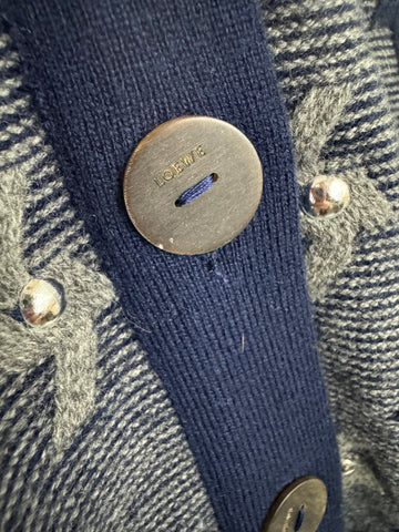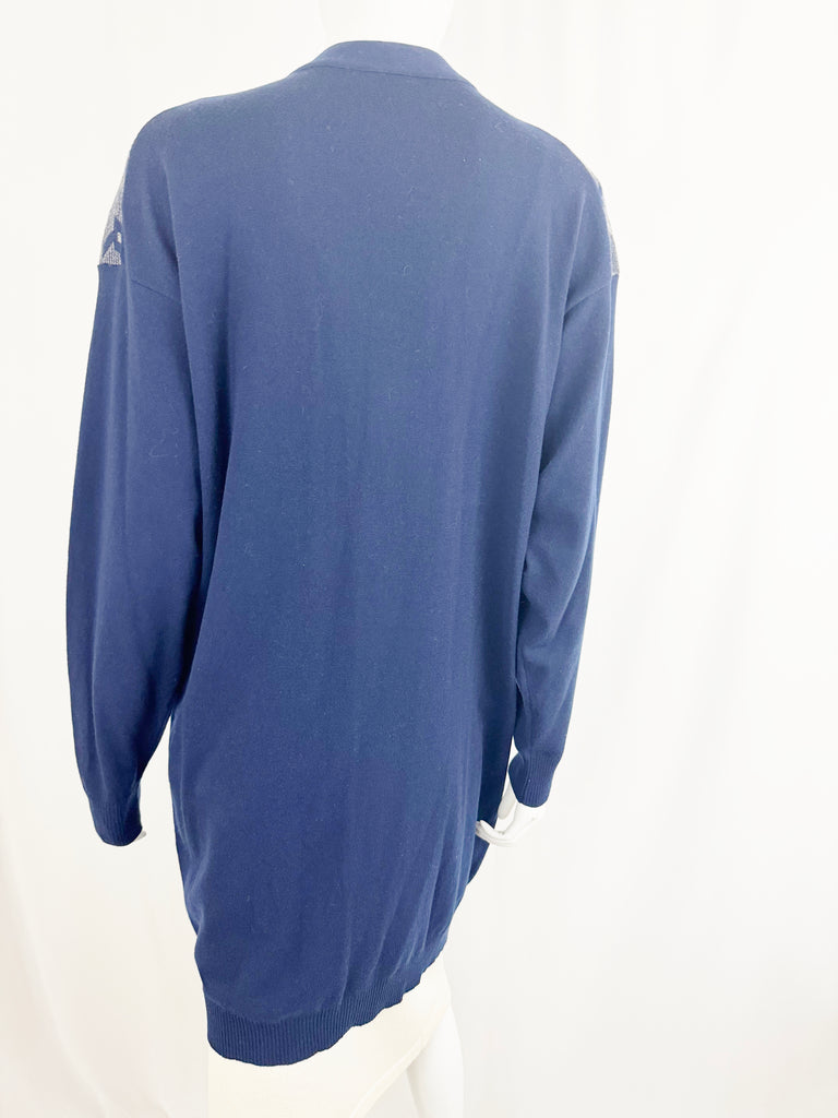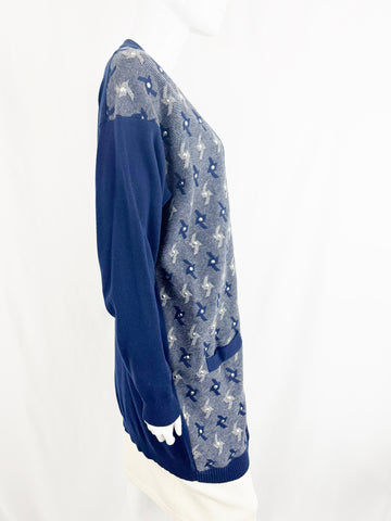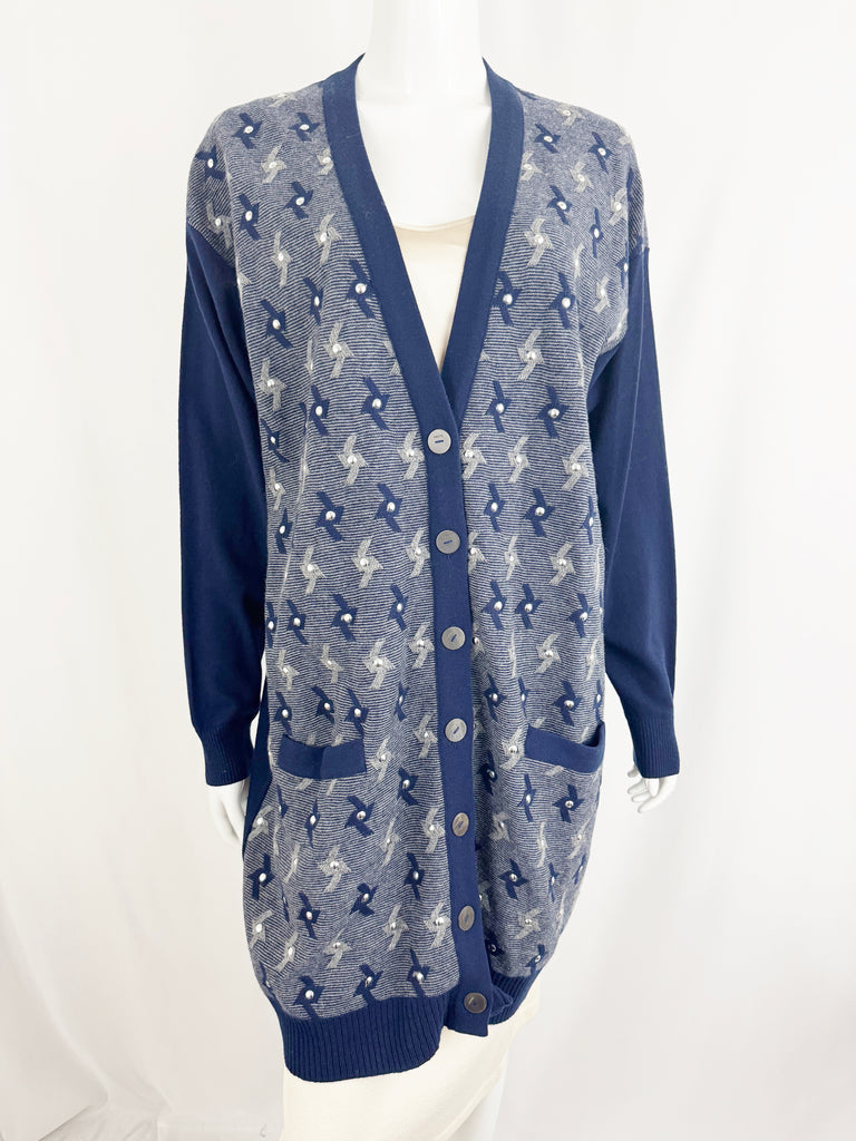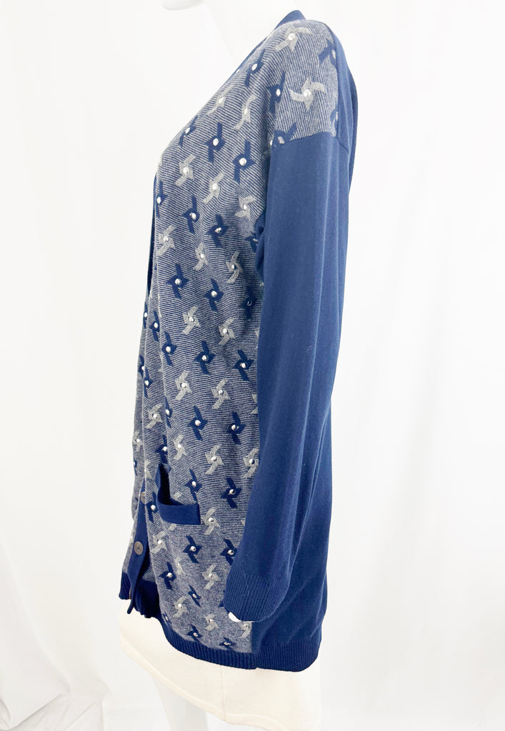 Description: NEW blue and grey patterned longer jacquard cardigan featuring silver-tone studs seven button closure, two front pockets and unlined.