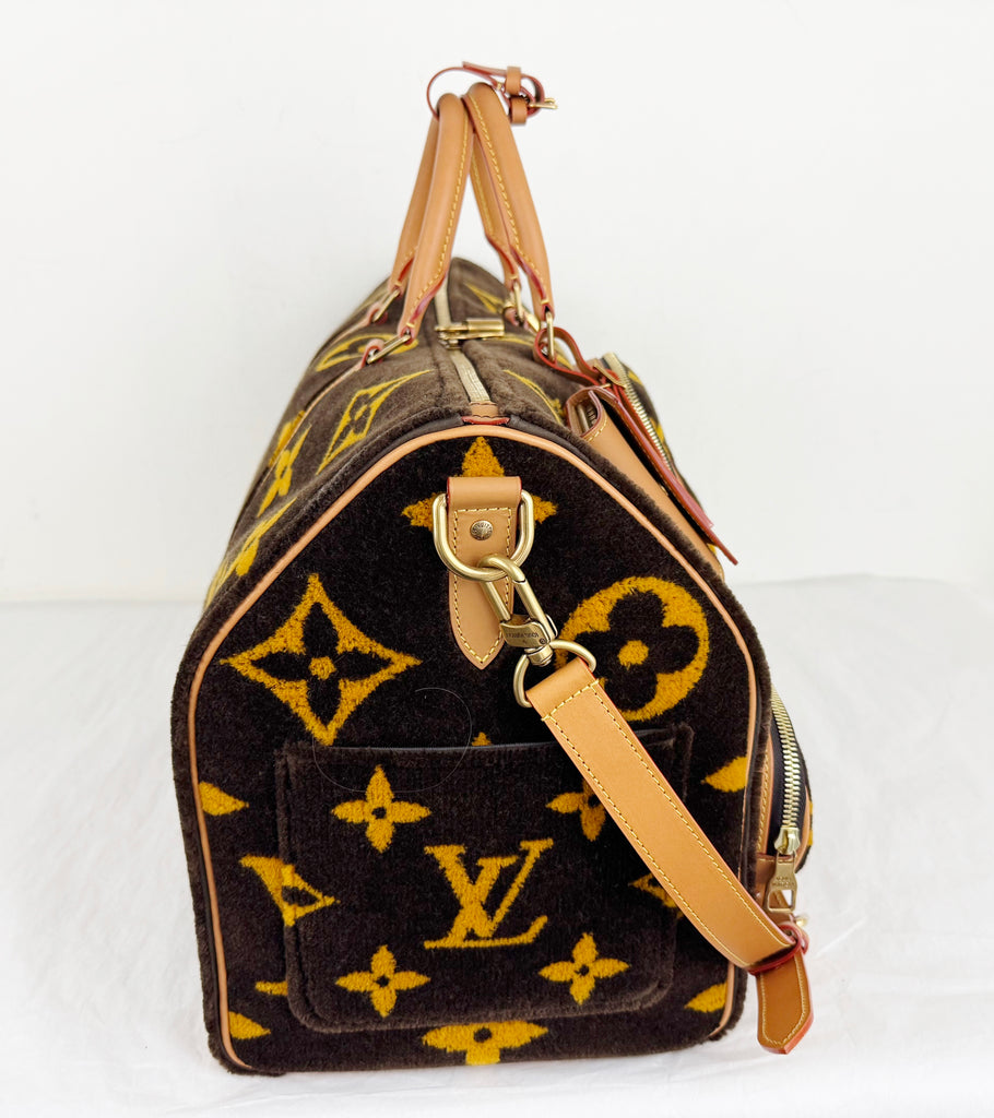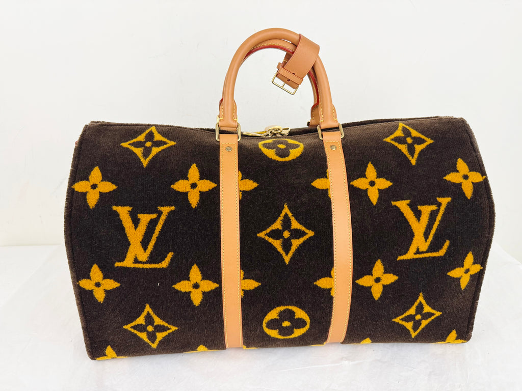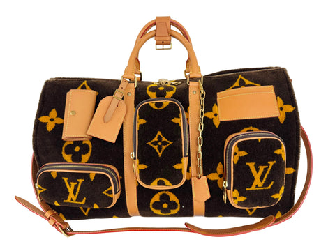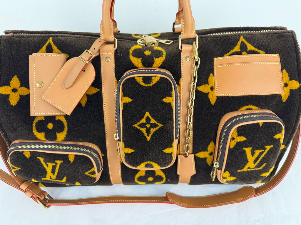 Description: 2020 velvet weekender bag from the Virgil Abloh collection featuring logo throughout, brass hardware, leather strap and duel rolled handles, five exterior pockets, top two-way zipper closure and twill lining with side pocket. Includes key, lock and dust bag.