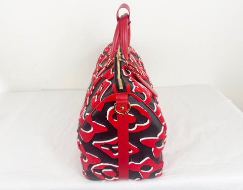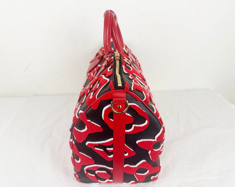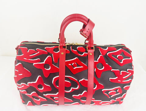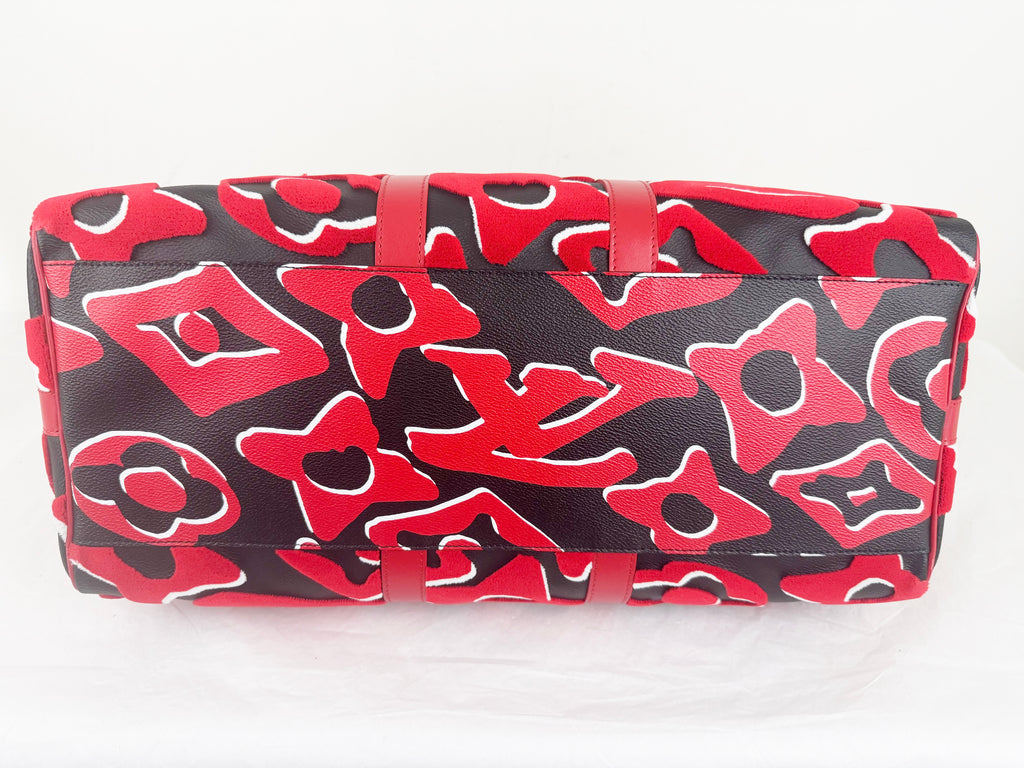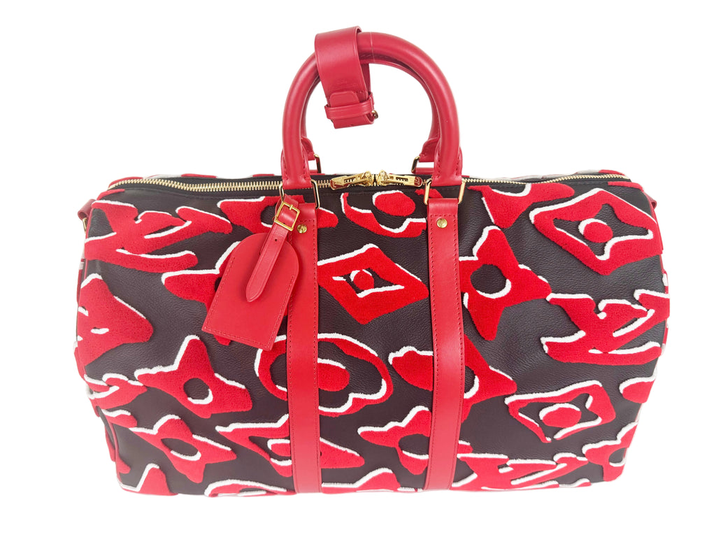 Description: Special edition 2020 LV keepall duffle bag featuring black with red velvet monogram design, duel rolled red leather handles and accent, brass top zipper closure, one interior side zipped pocket, detachable and adjustable strap, ID Tag, lock and two keys. Does not include dustbag.