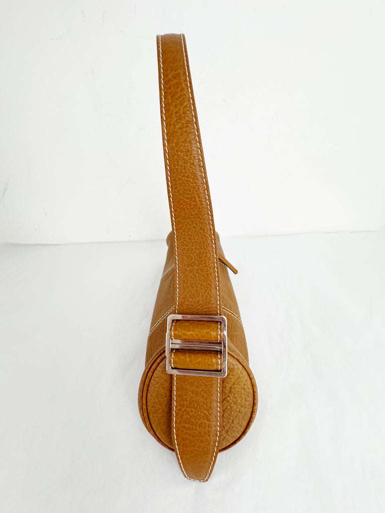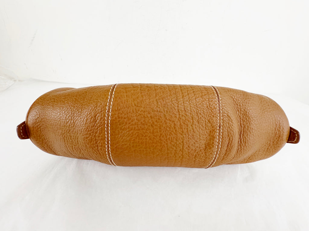 Description: Brown pebbled leather, silver-tone metal, top zip closure, canvas lined.