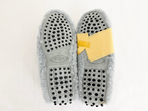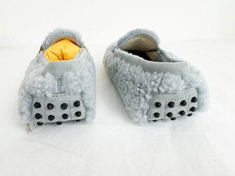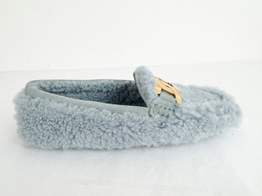 Description: Baby blue driver featuring suede trim, gold tone buckle accent, shearling lined, suede sole with rubber. Includes box