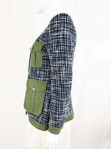 Description: Blue with white threads tweed jacket featuring green cotton trim and pockets, seven button closure, interior zipper for dickey (sold separately), button cuffs, four front pockets, and fully lined.