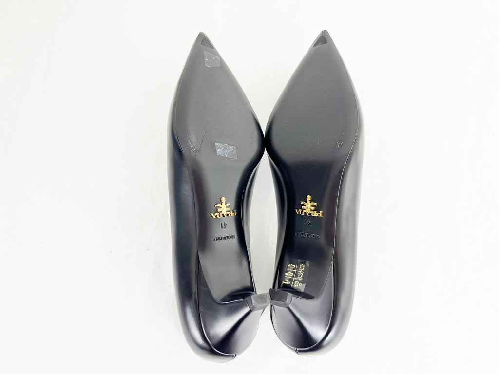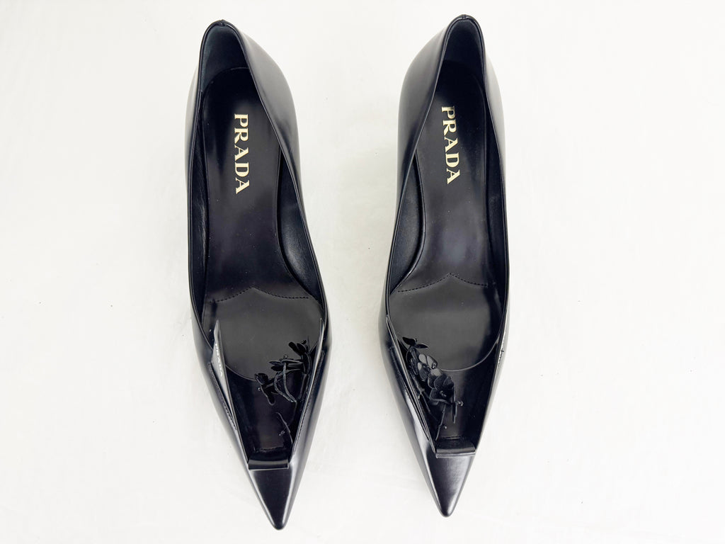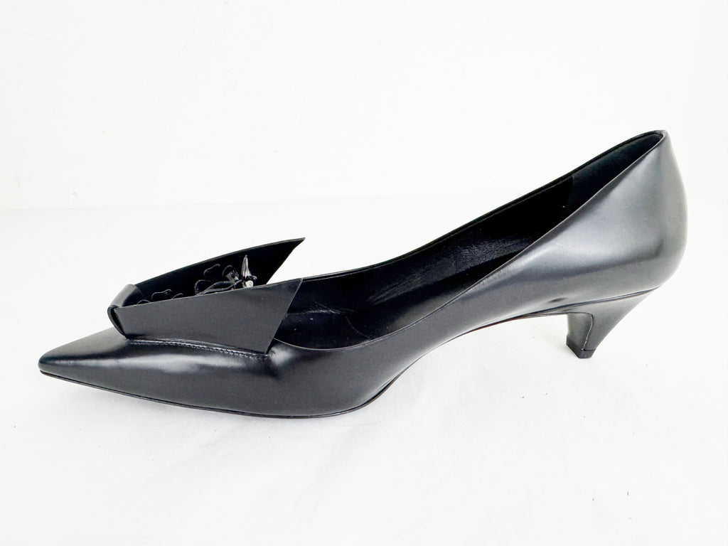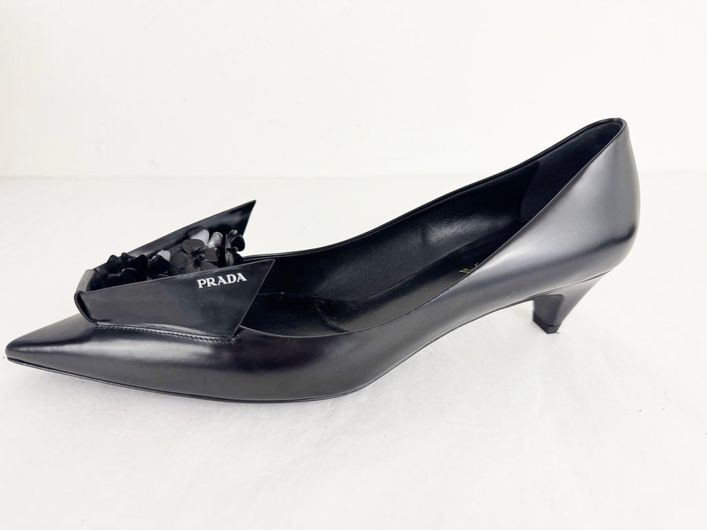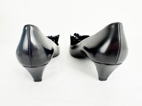 Description: Black leather pump with flower detail, pointed toe, kitten heel, leather lined and soled. Includes box and dustbag.