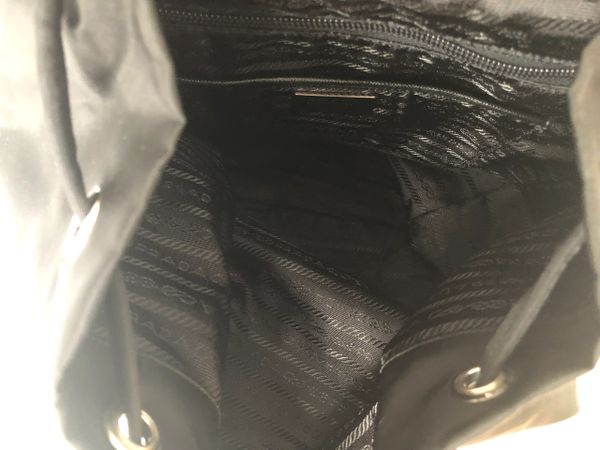 Description: Black Nylon Prada backpack, silver hardware, calfskin leather trim, two buckle closure pockets on front, buckle closure, drawstring closure, canvas lining, one zipper pocket, and one slip pocket.