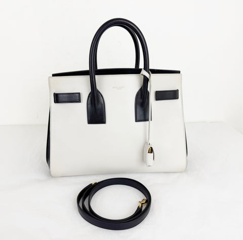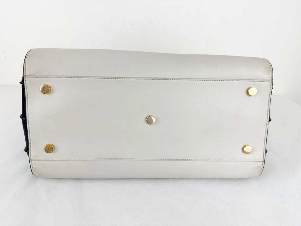 Description: Two tone handle leather bag, rolled handles, open center with zip center compartment, three interior pockets, suede lining, removable flat shoulder strap, belted front cinches sides, lock with keys, gold tone hardware and protective feet. Includes dust bag.