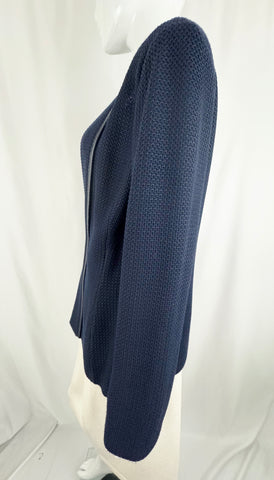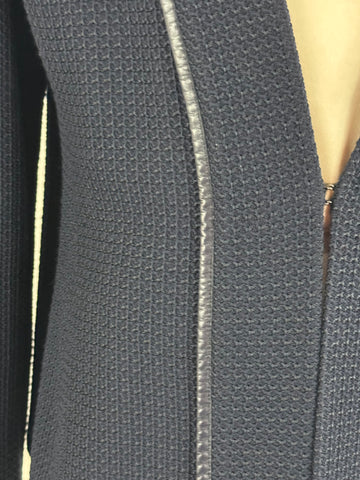 Description: Navy knit jacket featuring leather trim, shawl collar and single hidden hook closure.