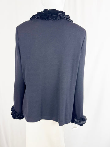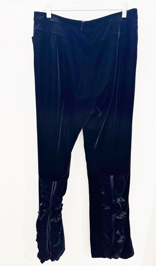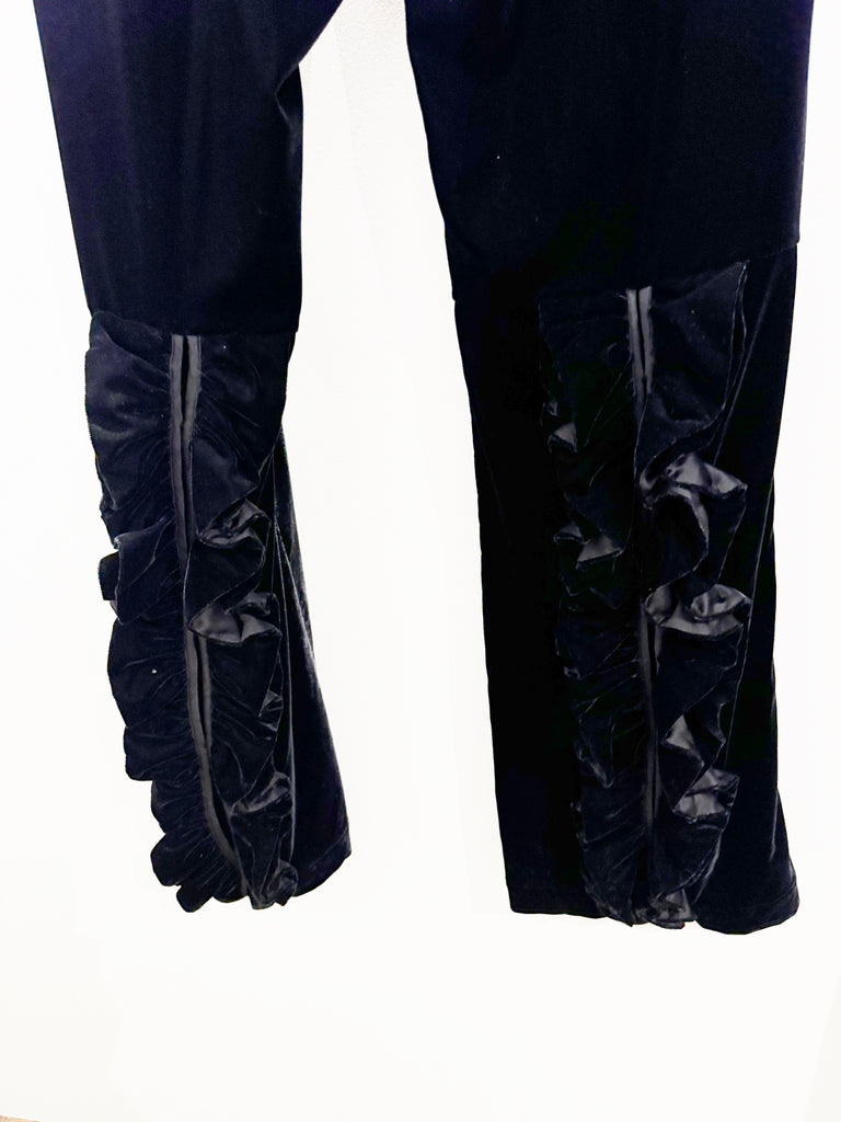 Description: Black jacket with velvet trim and cuffs, tie closure, velvet pants with front zip and hook closure and two front pockets. Both pieces unlined.