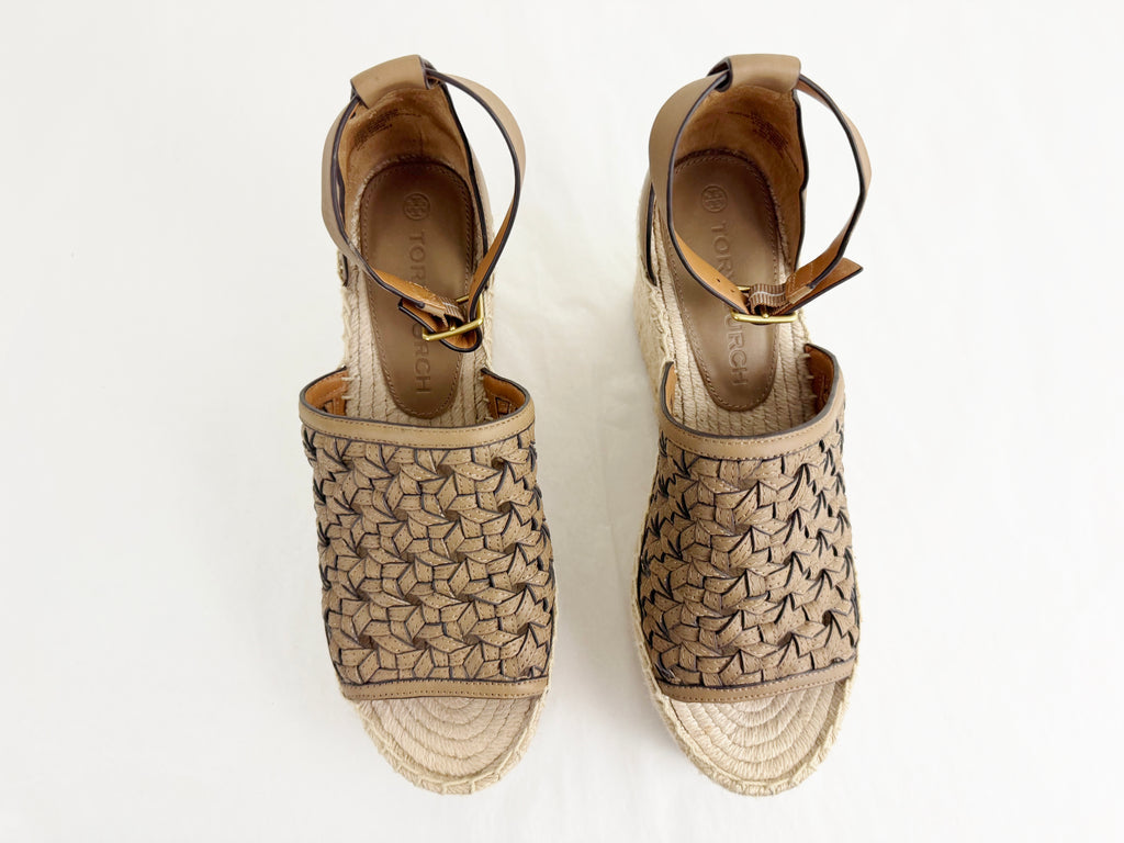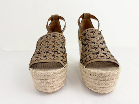 Description: Brown lattice wedge espadrille sandal